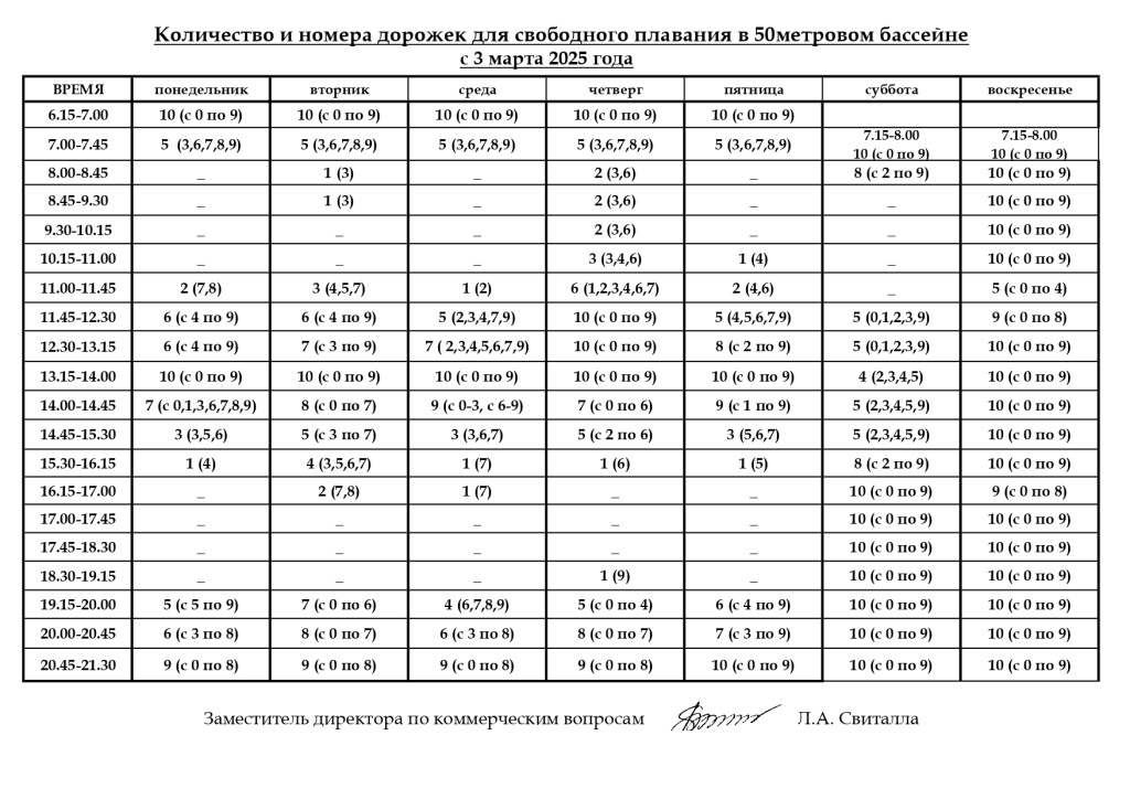 Расклад сеансаў вольнага плавання ў басейне 50 метраў з 1 сакавіка.
