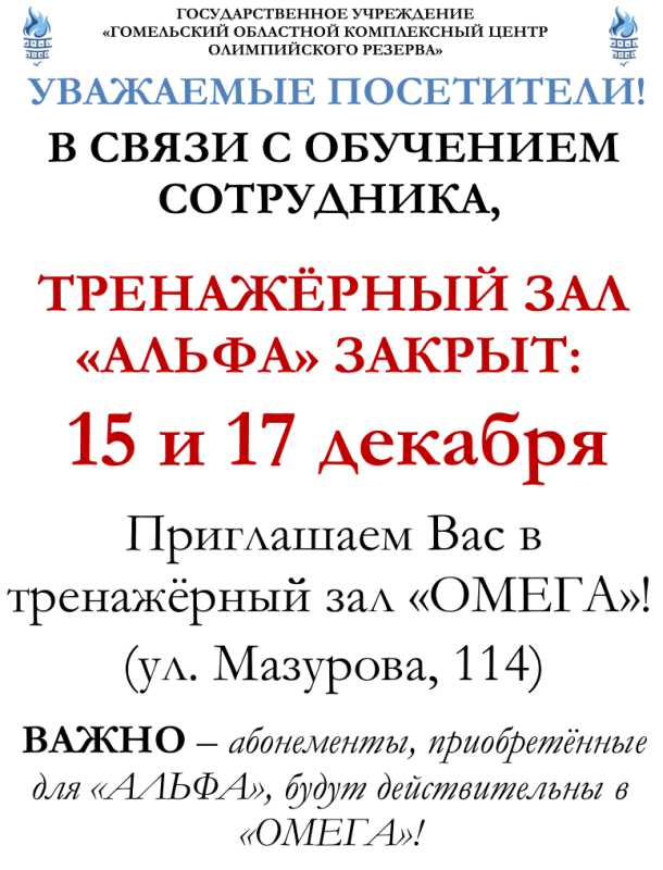 Трэнажорная зала "АЛЬФА" будзе закрытая 15 і 17 снежня!