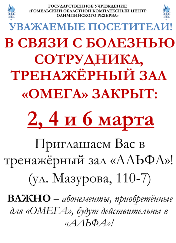 Трэнажорная зала "Амега" будзе закрытая 2, 4 і 6 сакавіка.