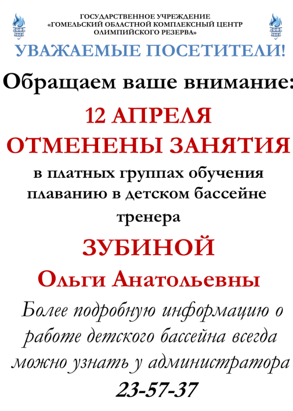 Важна! Адменены заняткі ў платных групах навучання плаванню Зубінай О.А.