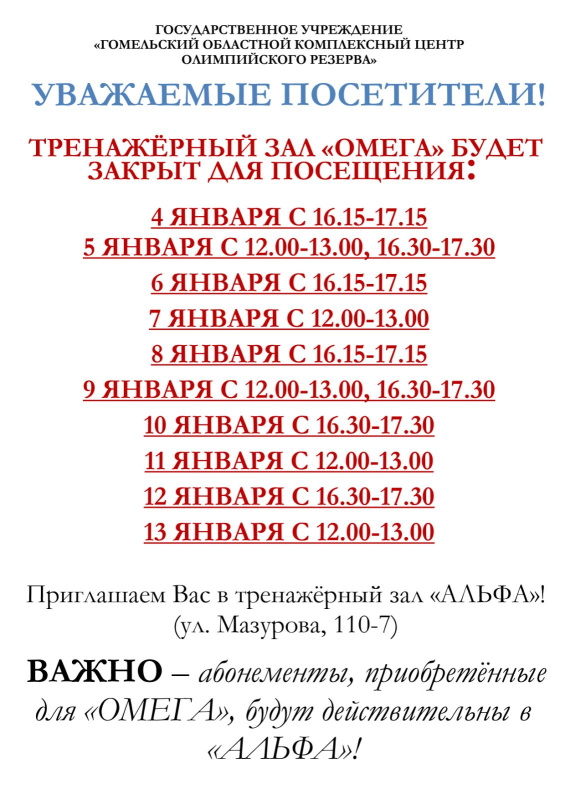 ЗМЕНЫ Ў ПРАЦЫ ТРЭНАЖОРНАЙ ЗАЛЫ "АМЕГА" З 4 ПА 13 СТУДЗЕНЯ 2026 ГОДА АДБУДУЦЦА Ў СУВЯЗІ З ПРАВЯДЗЕННЕМ ВУЧЭБНА-ТРЭНІРОВАЧНЫХ ЗБОРАЎ!