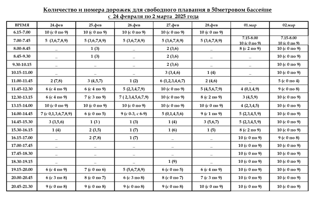 Змены ў раскладзе сеансаў свабоднага плавання ў вялікім басейне з 24 лютага па 2 сакавіка 2025 года.