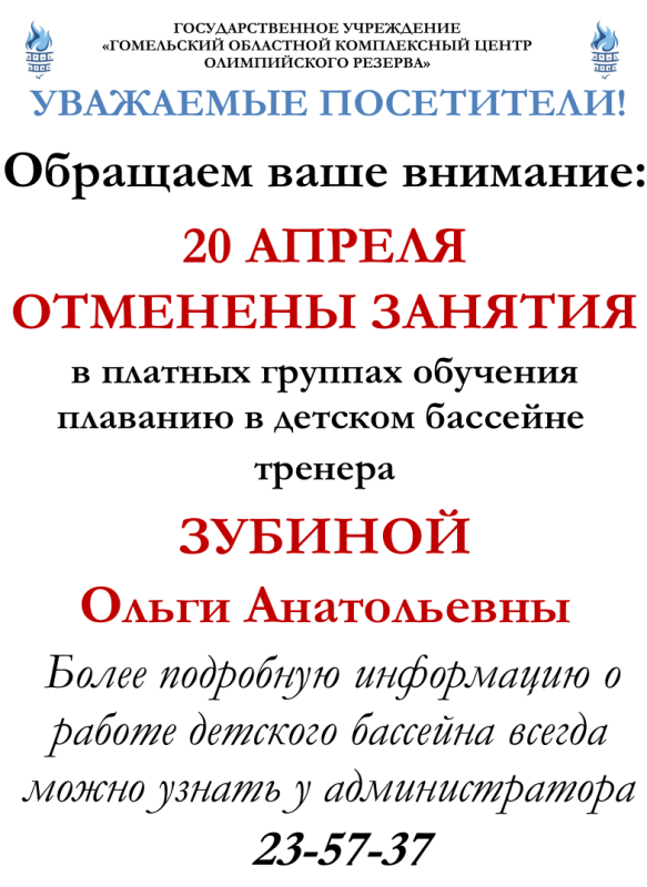 21 преля отменены занятия тренера Зубиной О.А.